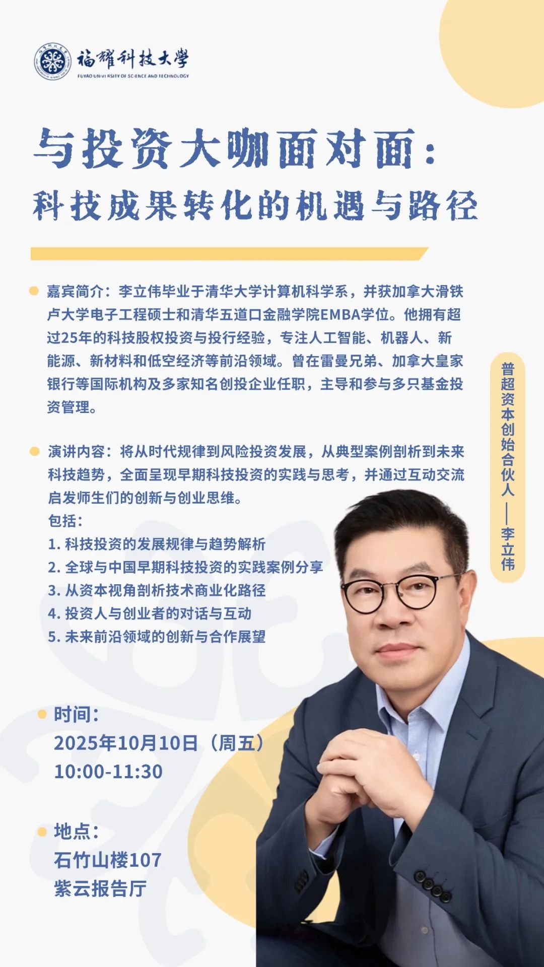 一项前沿技术,如何从实验室走向广阔市场,成长为改变世界的伟大企业?这背后离不开资本的远见与助推。为培养兼具创新精神与商业视野的创新人才,我们邀请拥有25年投资经验的李立伟先生,与学生们面对面探讨“科技成果转化的机遇与路径”,解码科技投资与成果转化的核心逻辑。